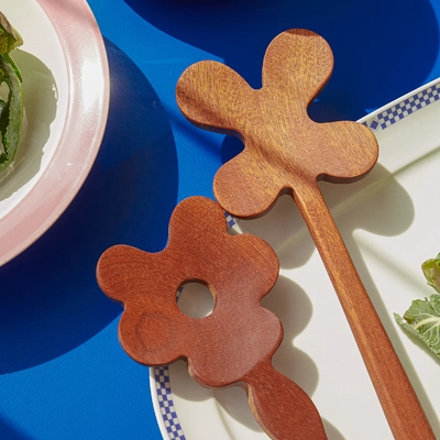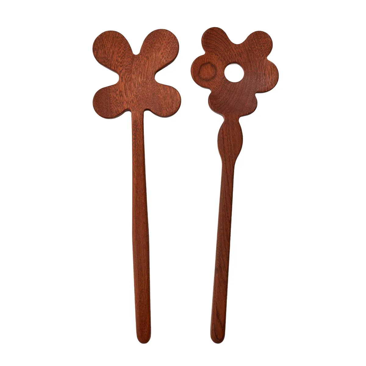 Set of wooden serving spoons carved into floral shapes.