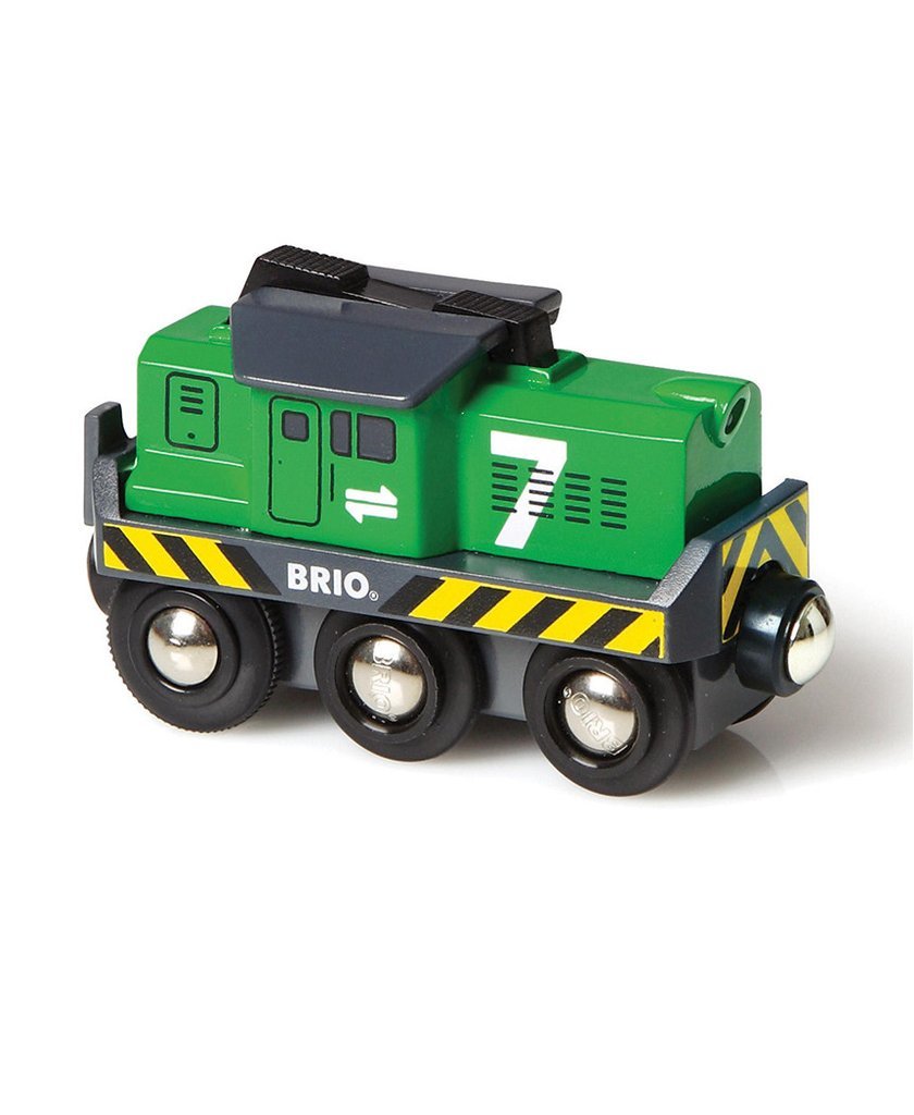 This is the battery powered freight engine! See the headlights in the distance of the BRIO train tracks. The freight engine can stop, reverse and go forward at any time you want with a simple push of a button.