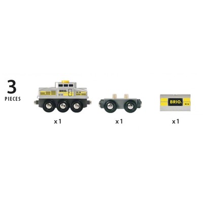 The Special Edition Train is an exquisite silver-and-yellow variant of the Push and Go engine. Push the button on the engine to release it from the load it is hauling. This BRIO train comes with a wooden tank wagon in matching design.