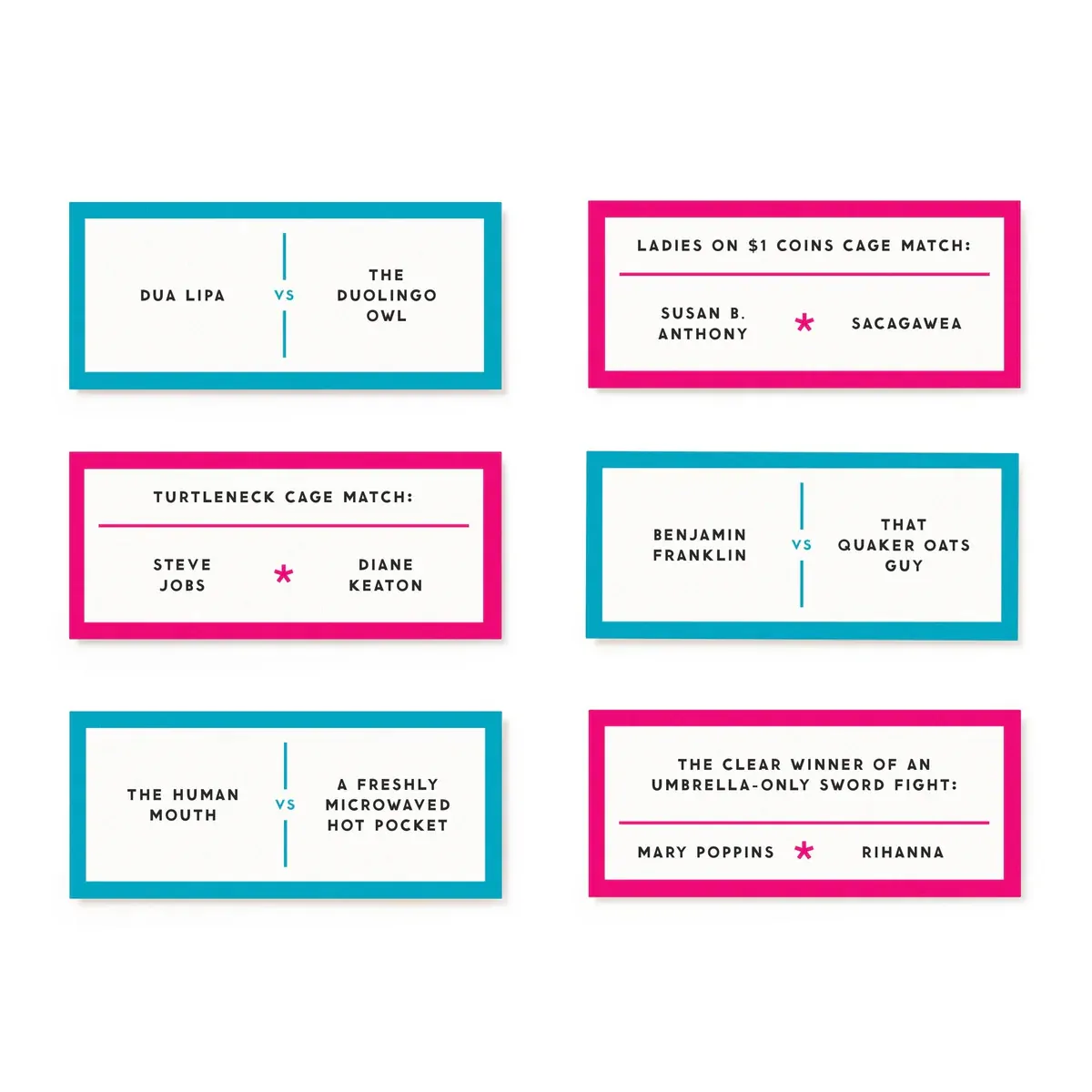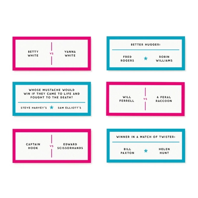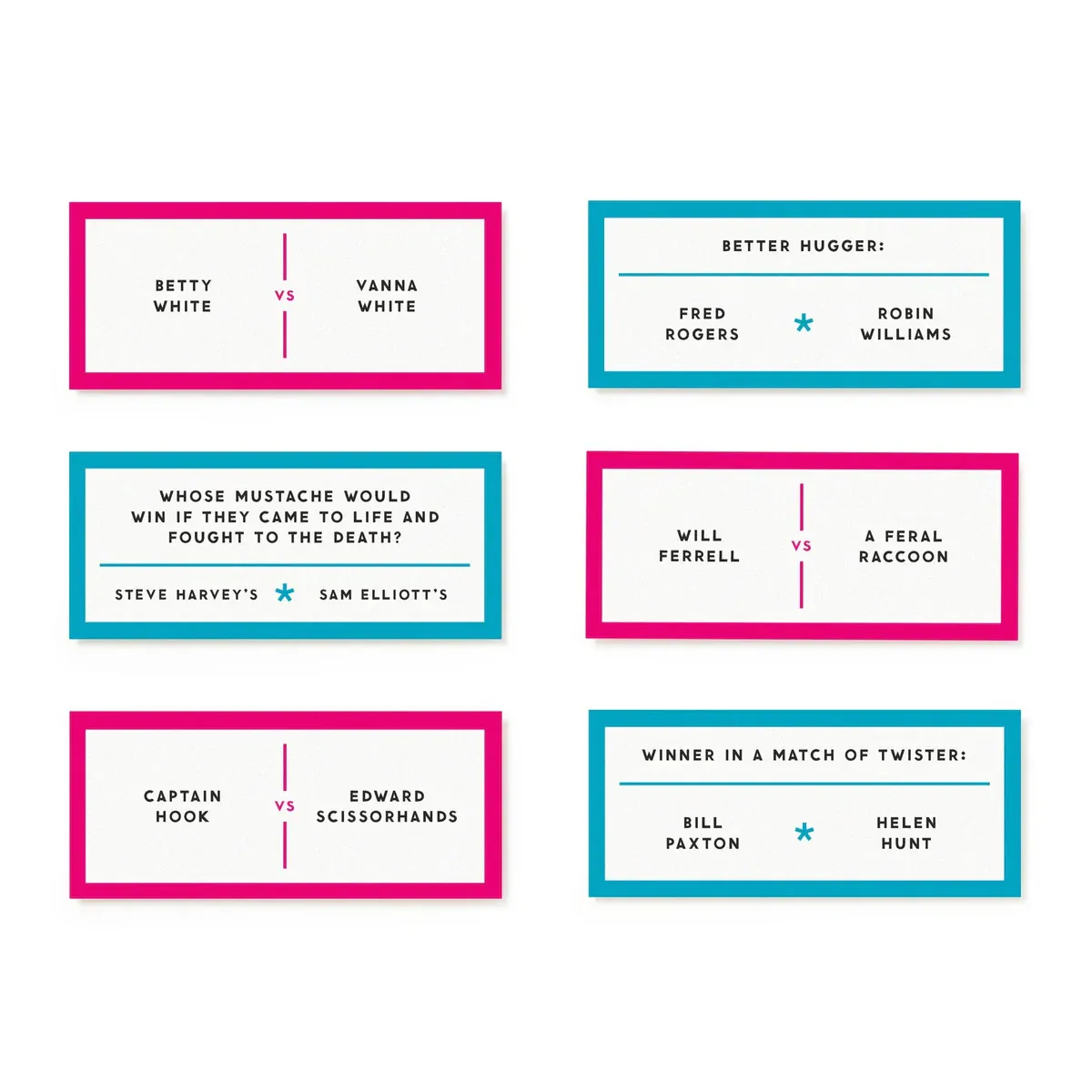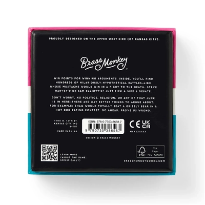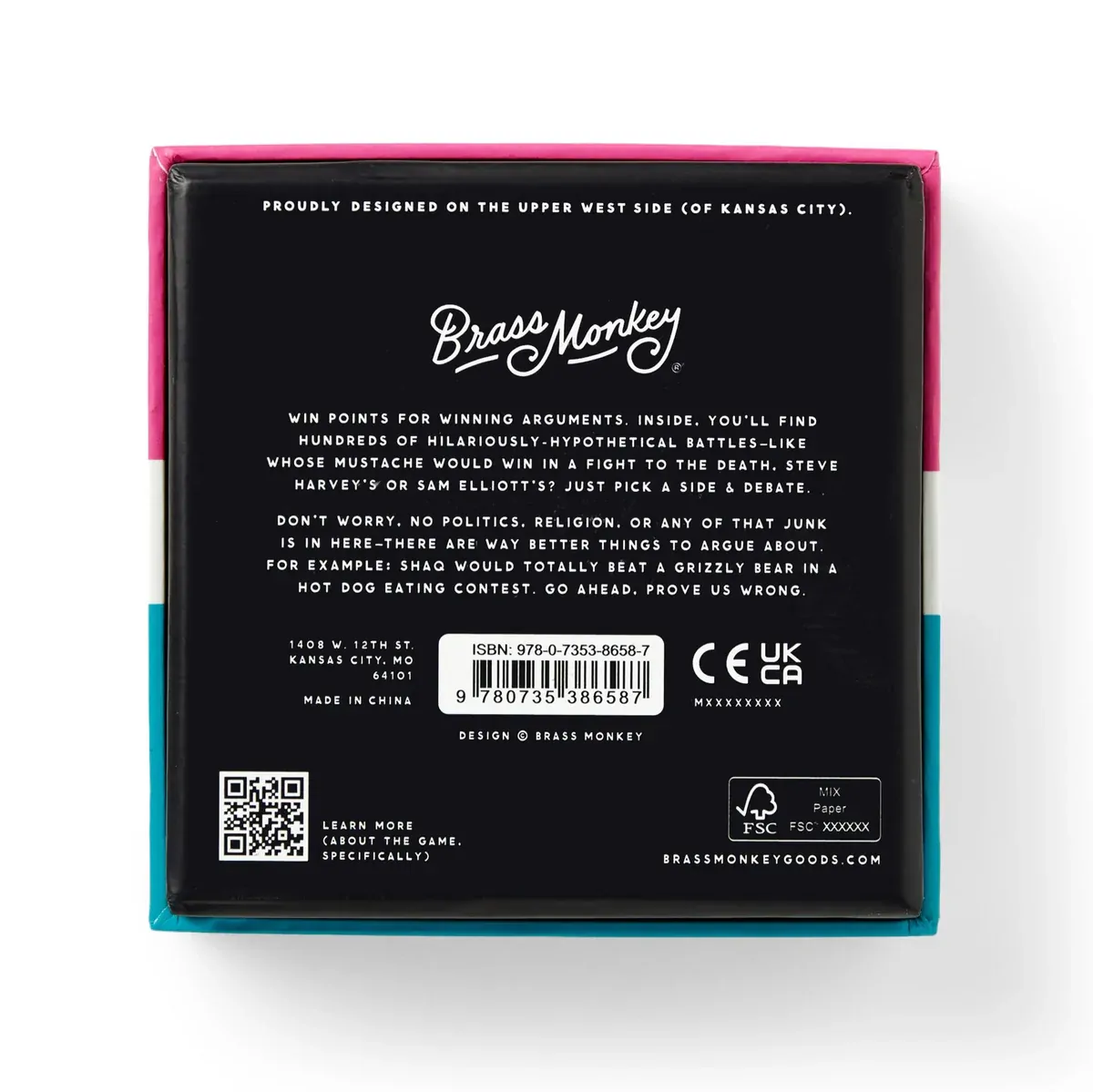 Win points for winning arguments. Inside, you’ll find hundreds of hilariously-hypothetical battles–like whose mustache would win in a fight to the death, Steve Harvey's or Sam Elliott's? Just pick a side and debate. Suitable for 2 to 4 (or more) players..