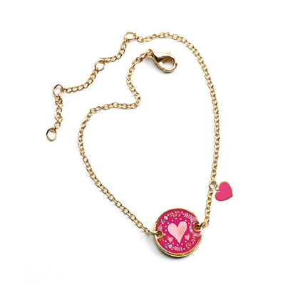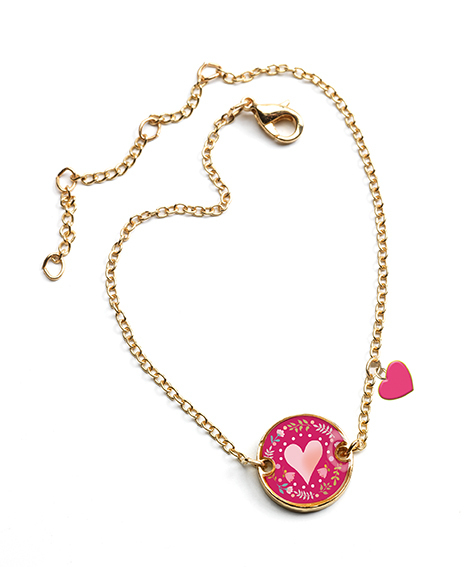 A gorgeous and special bracelet that features a love heart design resin medallion, adjustable gold plated chain, matt finish, clasp and a heart charm. Makes a wonderful gift and can be packaged with the necklaces found in the Lovely Paper range.