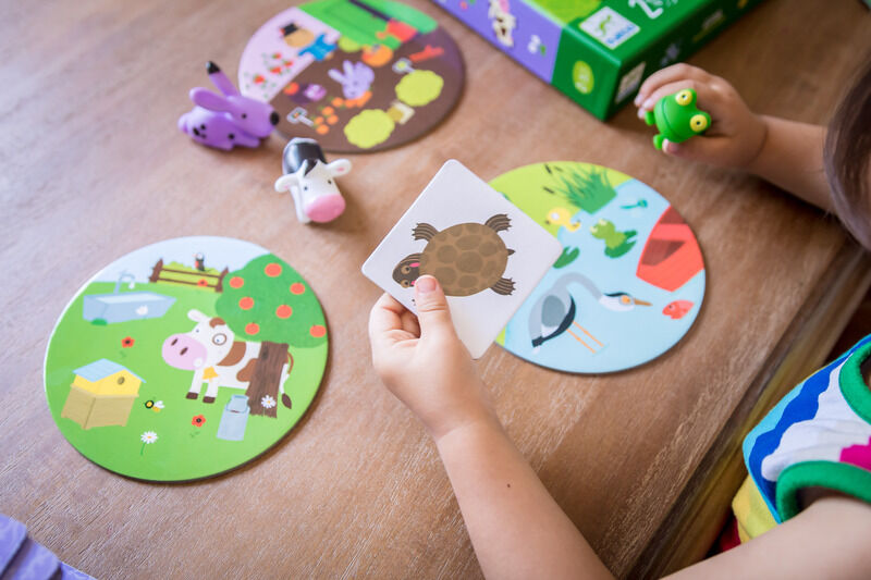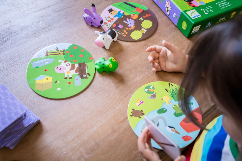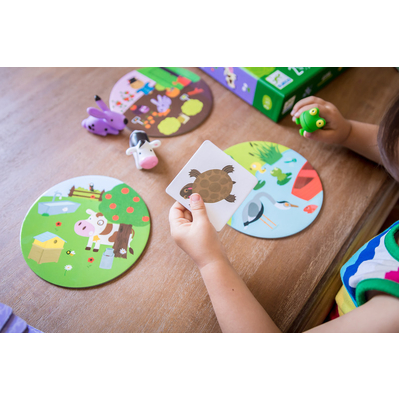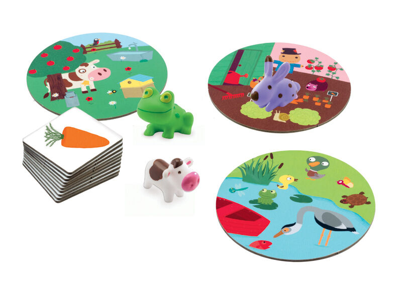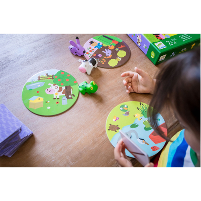 The rabbit lives in the vegetable garden, the cow is the meadow, and the frog in the pond. Where and who does the carrot belong to? The vegetable garden! Quick, land the rabbit figure on the vegetable garden card. This is a wonderful game by Djeco that helps children to develop their recognition skills while having fun! Children flip over one of the supplied cards and quickly place the correct figure on the correct card that matches the uncovered image.