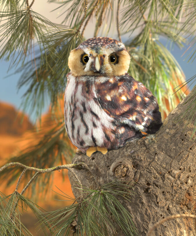 A small and adorable Pygmy Owl. Life-sized at 18cm tall with a lifelike illusion printed plush body and piercing owl eyes. The realism is supernatural with a head that rotates!