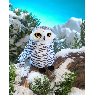 Get ready to take flight with the small snowy owl puppet. With its beautiful custom printed soft boa fabric and rotating head, this arctic owl is sure to capture your imagination. The large, expressive eyes make this compact-sized puppet come to life, making it perfect for storytelling and imaginative play.