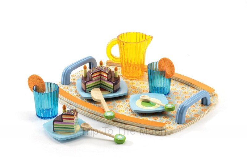 Time for a tea party with this fun tea set. Features a delicious looking cake with candles, plates, knife and spoons, jug, 2 cups with orange decoration all on a fabulous retro style tray. This set is suitable for little hands, with hard-wearing accessories that are easy to pick up and handle.