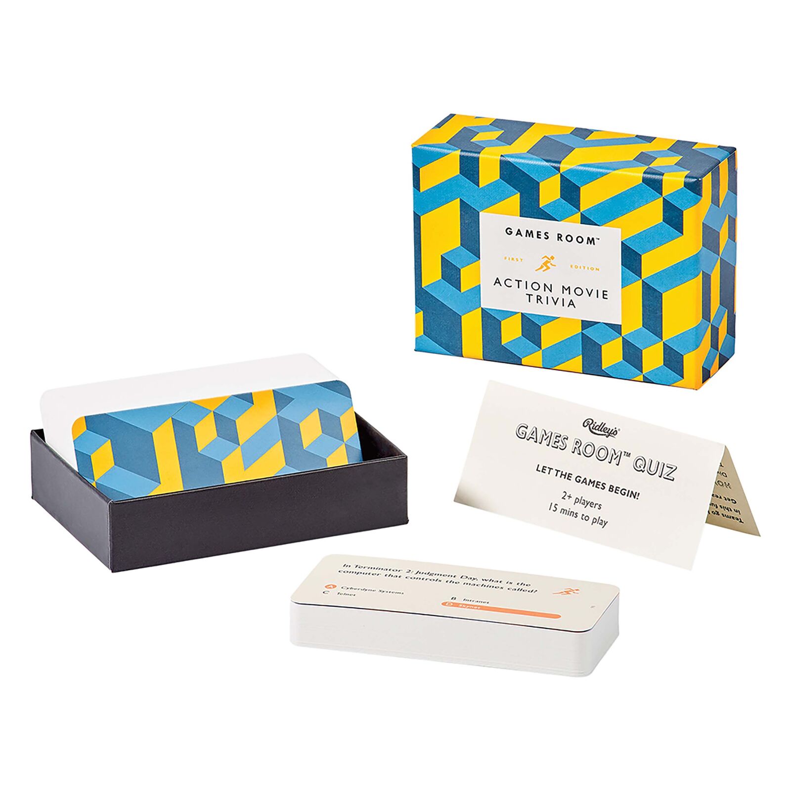 Strap yourself in for heart thumping high octane action movie trivia with this Games Room Action Film Trivia! Who will be the resourceful hero and who'll be the superfluous henchman? Test your knowledge of films from Die Hard to Taken and see who is the ultimate action film fanatic! 140 multiple choice question cards and instructions Packaged in a stylish geometric print box.