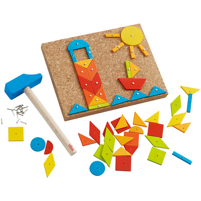 Inspire creativity and foster fine motor skills with the Haba Tack Zap How About That. Children are full of imagination and this Tack Zap version allows them to create and create. The 50 wooden geometric shapes encourage children to design houses, trees, vehicles, animals or whatever they can dream up. In addition to play, children will naturally boost their concentration and fine motor skills. The pack contains a corkboard, 50 wooden shapes, a wooden hammer and nails. Tap, tap... lets have some real hammering fun!