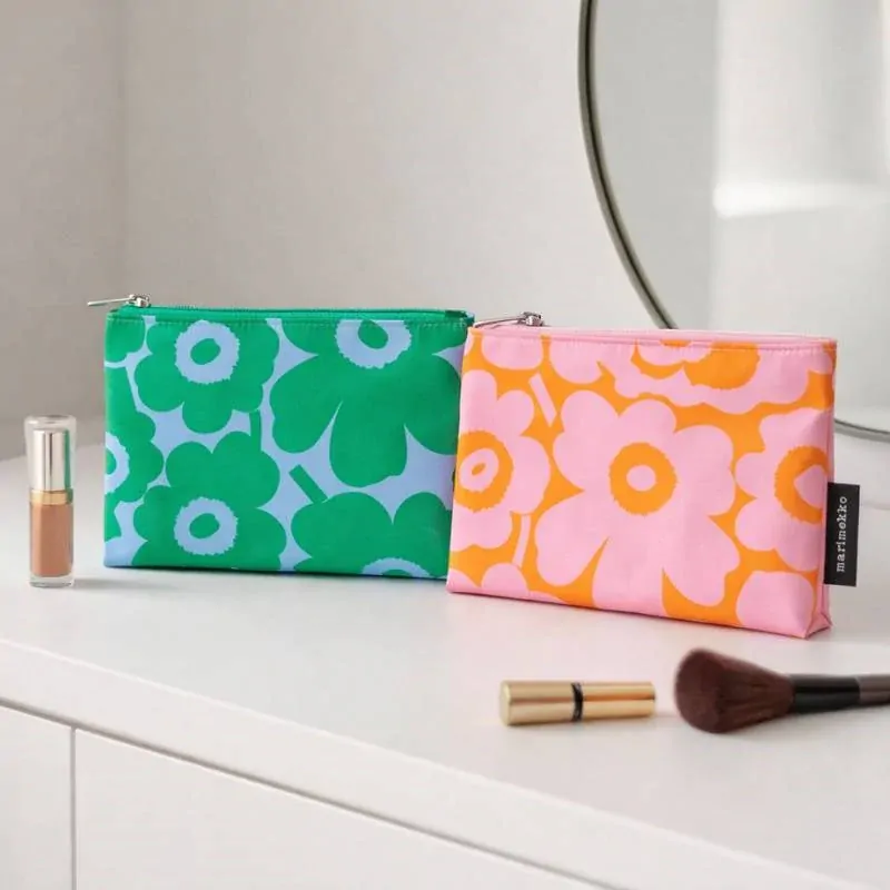 The small Kaika Mini Unikko cosmetic bag is made of polyester. The bag has a zipper closure and lining on the inside. This product is made of 100% recycled polyester. Marimekko´s famous pattern Unikko was born in 1964 in a time when the design house's collections featured mostly abstract prints.