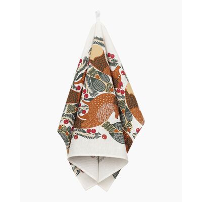 Made of a cotton and linen blend, this tea towel features the white, red brown and gray Ketunmarja pattern. Exuding mysterious enchantment, the Ketunmarja (fox berry) pattern features foxes that have crept at dusk into a garden with little birds sitting in a yew tree.