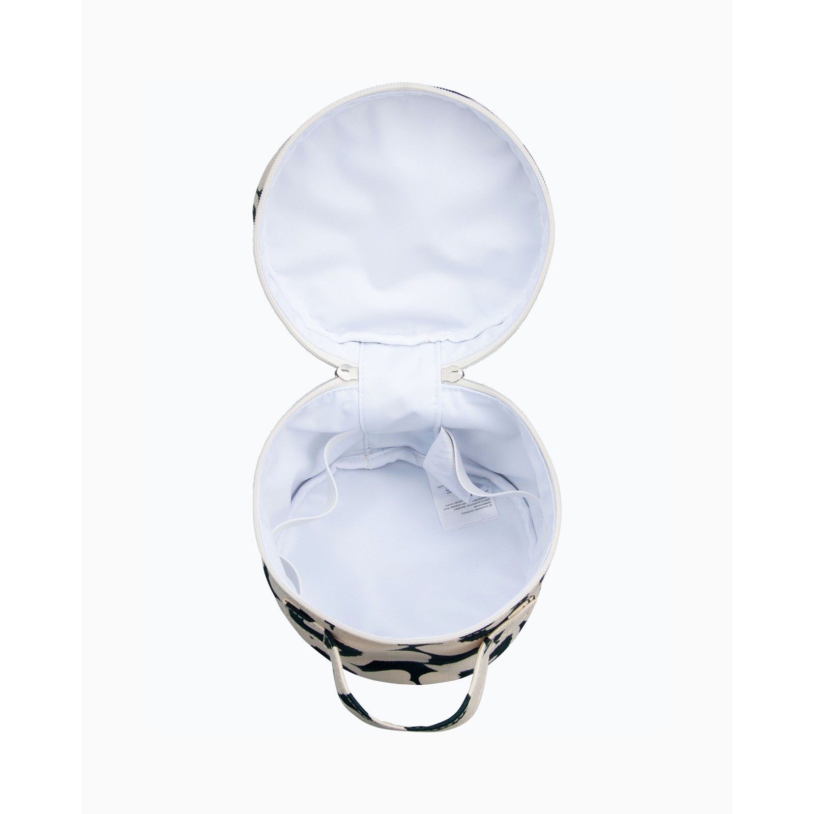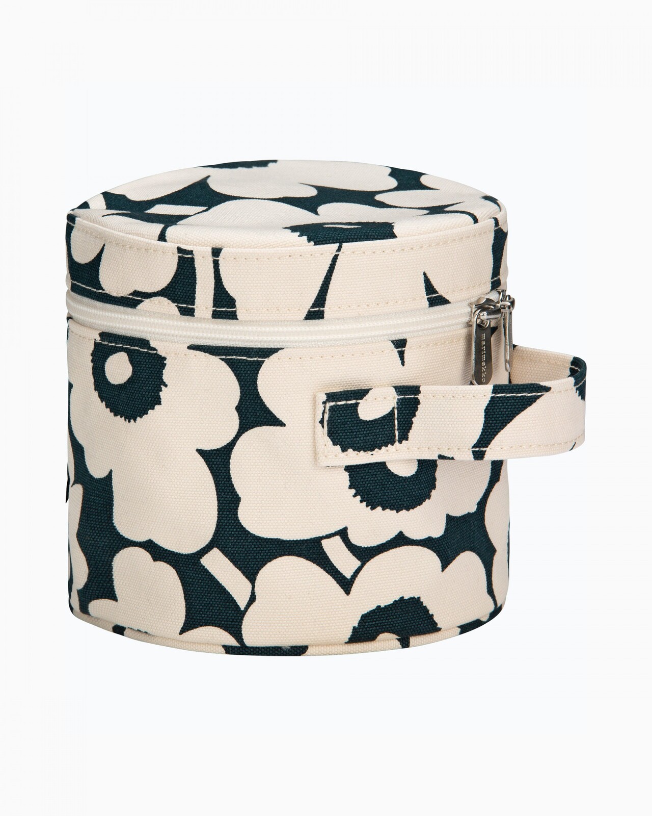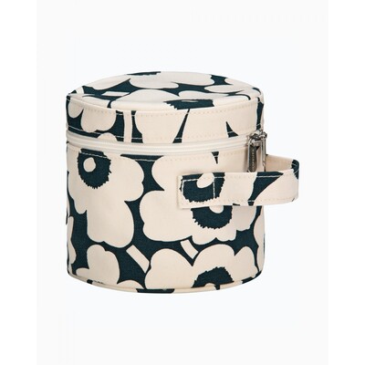 The Liuske cosmetic bag is made of heavyweight cotton canvas in the Mini Unikko pattern, which is printed in Helsinki. Shapes of natural stones have inspired the design of the bag, which has a zipper closure and a handle on the outside. The inside features a nylon lining and an elastic band that circles the inside, ideal for storing brushes and small bottles.