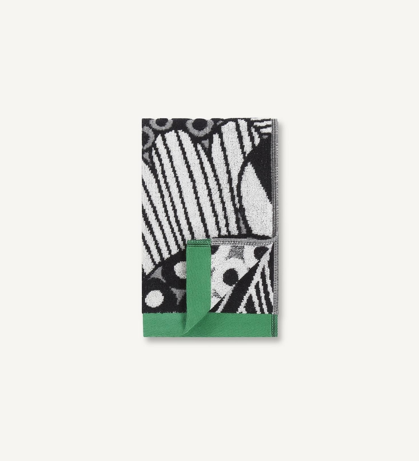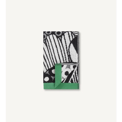 A cotton terrycloth guest towel feathuring in the large scale Siirtolpauutarha pattern with green end edges.