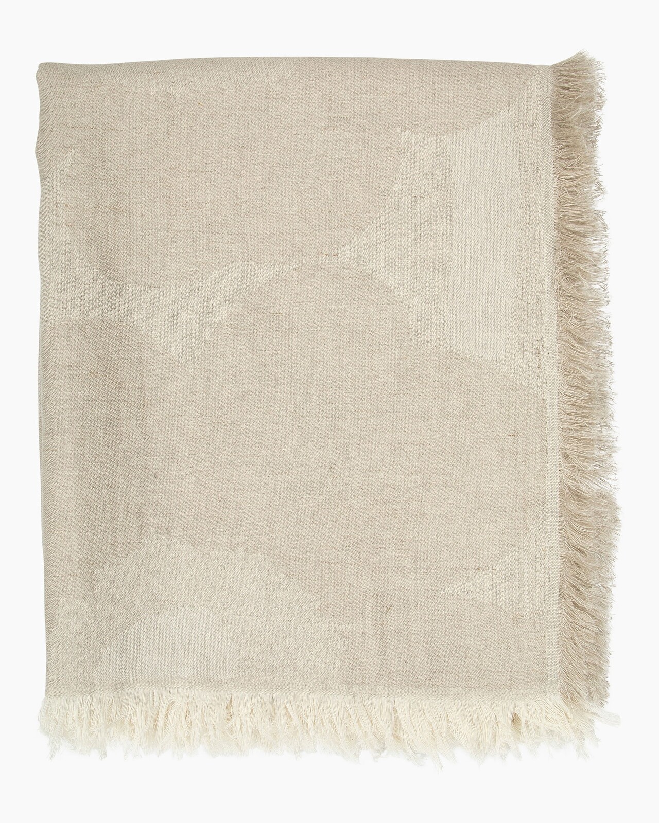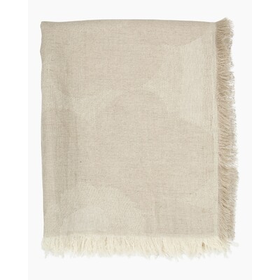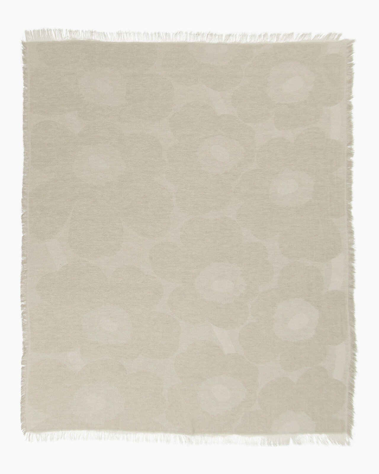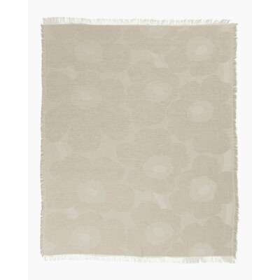 The lightweight blanket is made from a linen and cotton blend with a jacquard knit. It features the off white and linen coloured Unikko (poppy) pattern and fringes at the ends.
