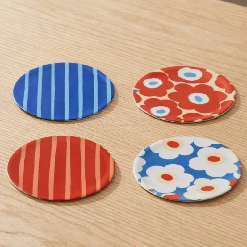 This round coaster features the Unikko pattern. We recommend wiping the coaster clean with a damp cloth or washing it by hand. Do not soak.