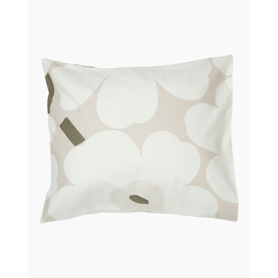 This soft cotton and linen blend pillowcase features the beige, white and green Unikko (poppy) pattern.