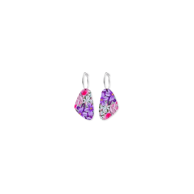 Each softly contoured shape hangs from a small sterling silver ring, creating an easy, fluid drop that moves gently as you do. Bright florals in pinks, purples, soft blues, and touches of white give this piece a lively feel, balanced by the simplicity of the form.