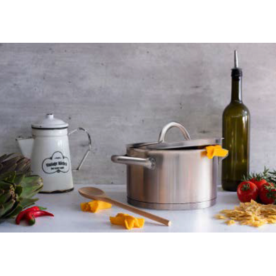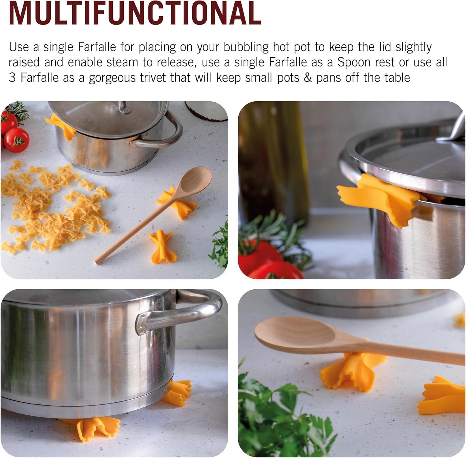 These pasta shaped steam releasers are an amazingly simple, yet hugely efficient kitchen gadget that will add beauty and functionality to your kitchen. Use just one Farfalle for keeping the lid of your hot pot slightly raised to let off steam. Keep your worktop clean and tidy by using Farfalle as an amusing spoon rest to park your cooking tools. Surprise your guests by using all 3 of your Farfalle set as a trivet for keeping hot pots off the tabletop.