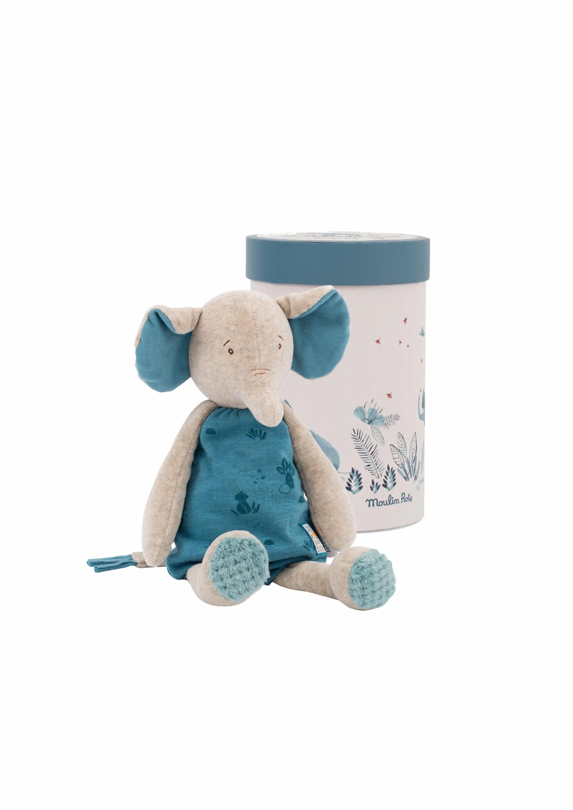 Bergamote the elephant from Moulin Roty ‘Sous mon Baobab’ range, would make a lovely snuggling companion. Bergamote has soft and gangly grey jersey arms and legs, perfect for grasping and cuddling. And his face is also made from a soft jersey, with a cute trunk, floppy blue and grey ears and facial features embroidered for safety. Bergamote’s squishy, soft body is made from a botanical printed blue-grey coloured stretch fabric. Bergamote’s feet soles are lined with super soft blue chenille fabric, and his tail is finished with stretchy blue cotton, perfect for twirling and grabbing by little fingers.