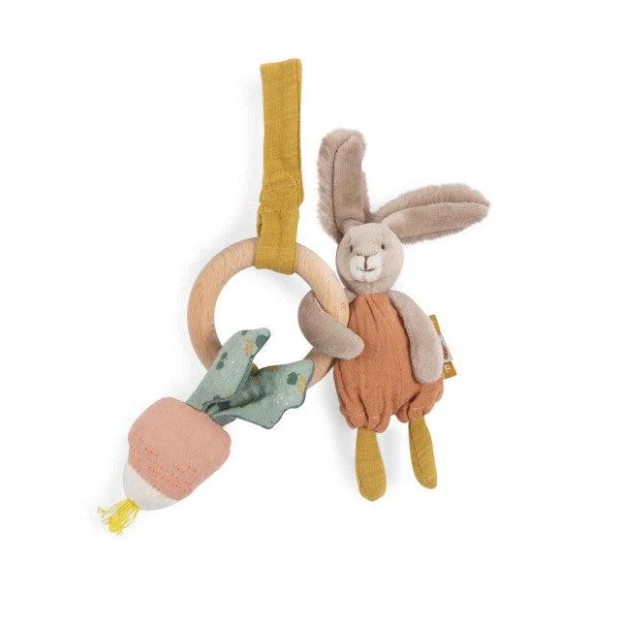 2-in-1 rattle: a little cuddly rabbit and an activity toy for baby! Made of various different materials with a natural wooden ring, it makes a ting-a-ling and rustling paper sound when shaken. Can be hung up using the velcro tab.