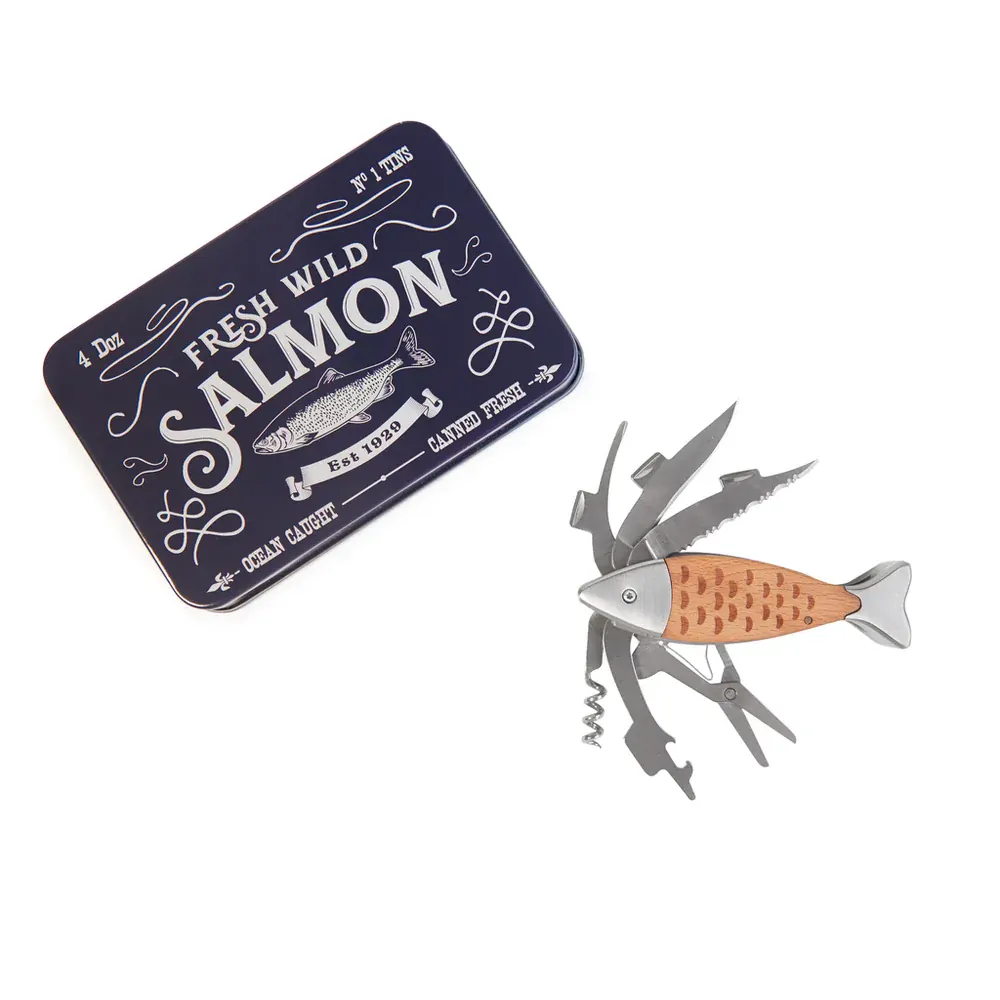 This salmon-shaped multitool has it all! Scissors, screwdriver, bottle opener, knife, and corkscrew—all in one clever design. Packed in a vintage fish tin, it's a perfect gift for sea lovers, DIY enthusiasts, or anyone who loves to be prepared.