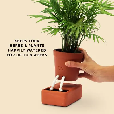 Keep your herbs and plants happily watered for up to 8 weeks! Fill the ceramic foot spa with water then dip the happy pot’s little feet into the water. His cotton legs slowly draw up the perfect amount of water keeping the soil from drying out, and keeping your plants and herbs happily watered for up to 2 months. The perfect size for shop-bought potted herbs and small plants.
