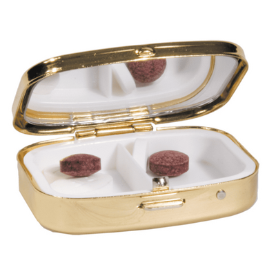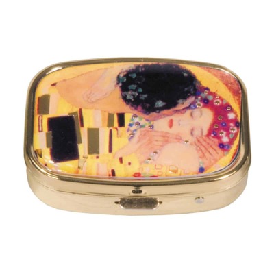 Masterpiece pill box. Features a polished metal alloy with resin fine art cameo inserted in the top. Flip-lid opening, hinged for closure. Two different compartments inside. Packaging: Cellophane sleeve. Design : (Klimt – The Kiss)