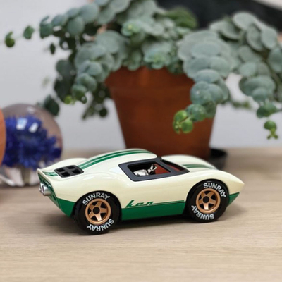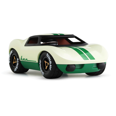 Ken Cline is a sleek, vintage-inspired racing car featuring an off-white body with bold green racing stripes. Exuding timeless style, the driver sports a chrome helmet, perfectly complementing the car's chrome dual exhaust pipes. The sunray rubber tyres with gold-accented stylish wheel spinners add a touch of sophistication, making it clear that this car means business.