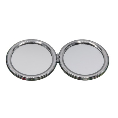 Interior has a polished metal alloy inner with two different magnification mirrors inside. Hinged for closure.