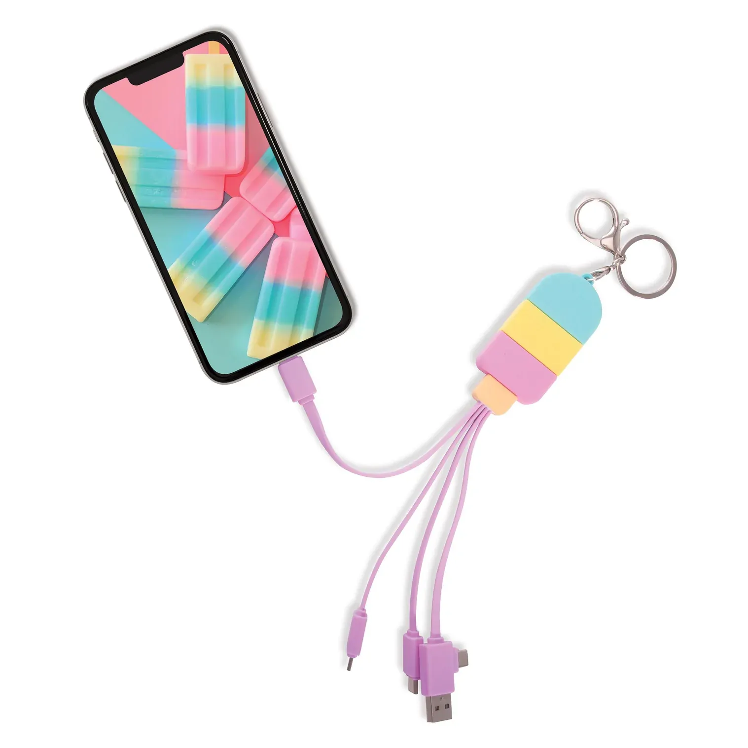 USB A & C input + micro-USB, USB C & lighting output on a handy and super-cute popsicle keychain.