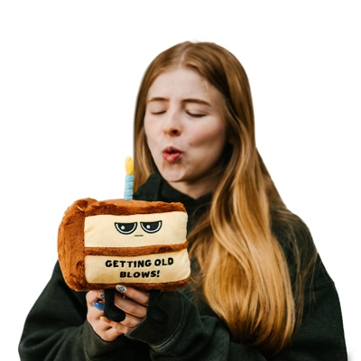 This Punchkin knows that getting old blows! He knows that life isn’t always a piece of cake, it’s batter when you’re younger, and that dreams don’t always crumb true. But hey, it’s your birthday, and you don’t need to hear that. So, cake it easy or whatever. Happy Birthday…I guess? This plushie’s angry eyes perfectly express his feelings about another year around the sun, while his 3D candle and colorful sprinkle toppings are just the icing on top of the cake!