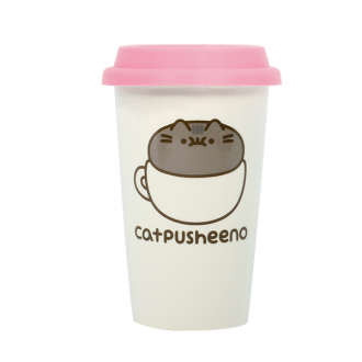This striking travel mug with durable double-walled ceramic and spill-proof silicone lid features Pusheen enjoying her favourite drink - a catpusheeno!?Microwave and dishwasher-safe. Capacity: 275 ml. Height: 14cm.