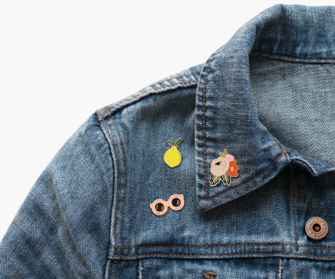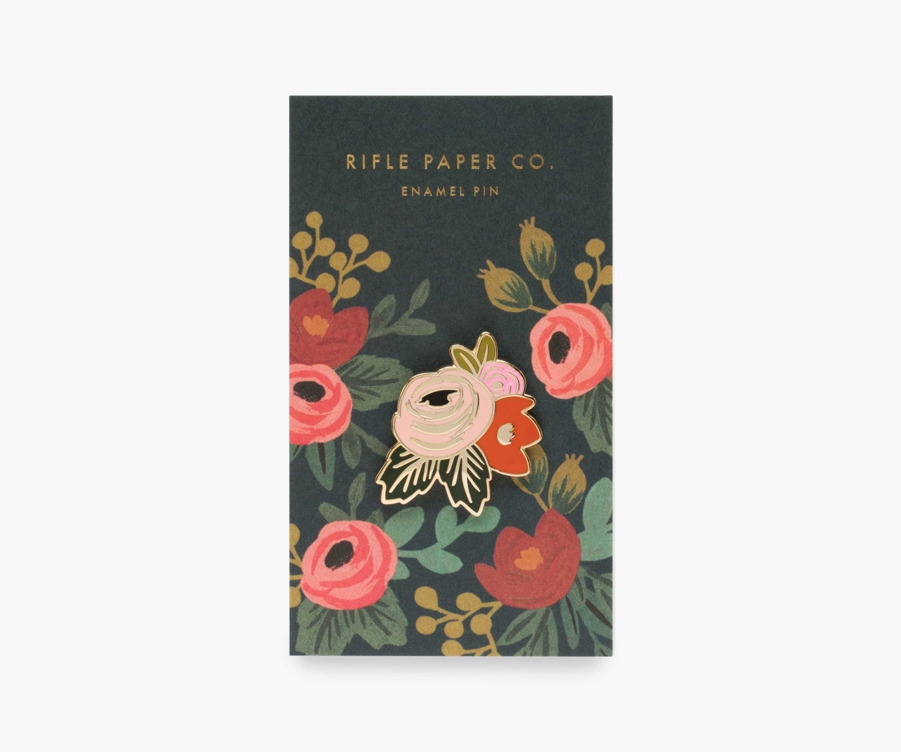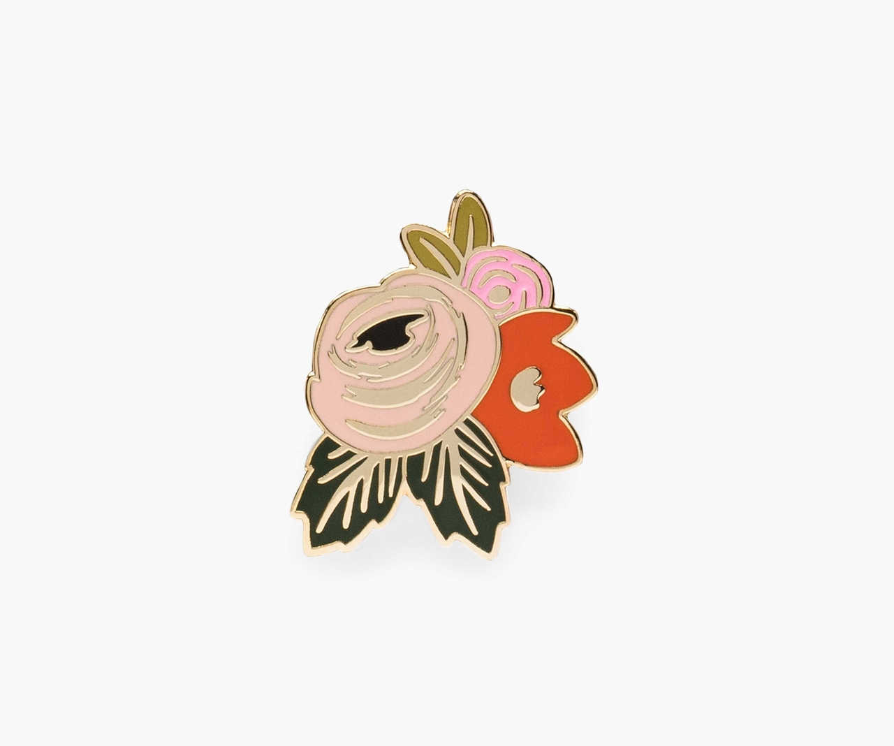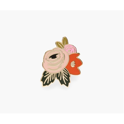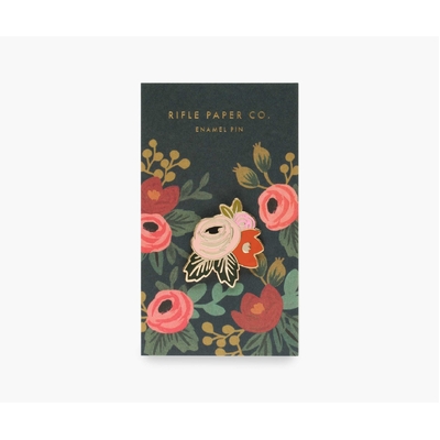 This glossy Enamel Pin features some of Rifle Paper co.'s favourite florals, characters, and objects. The rubber clutch backing keeps it safely attached to your favorite jacket, backpack, or tee. Each pin is packaged with an illustrated backer to set the scene.