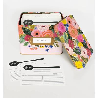 The Juliet Rose Recipe Box from Rifle Paper Co will bring warmth and beauty to any room of the house, not just the kitchen! With a bright floral design and a label frame on the front, the Juliet Rose Tin Recipe Box combines an elegant, vintage feel with classic and functional design. Included with the recipe box are 12 letter pressed dividers and 24 recipe cards.