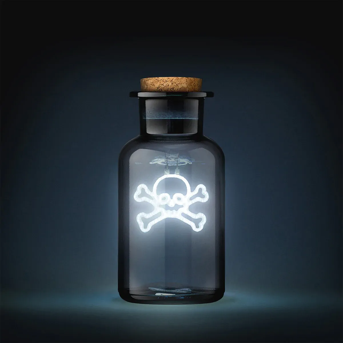 Glowing vintage apothecary bottle. Poison skull design. Kitschy and witchy, this poison potion design is sure to draw attention! Skull shaped filament is powered by an internal battery. 6 hour battery life on a 1.5 hour charge.