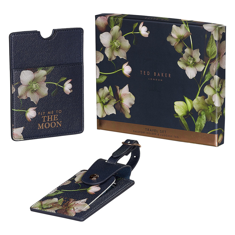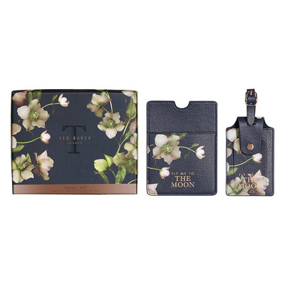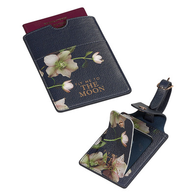 Travel in style with this smart and practical Arboretum Passport Holder & Luggage Tag Set by Ted Baker. The faux leather passport holder is decorated with a beautiful flower pattern, has the Ted Baker logo embossed in rose gold and reads 'Fly Me to the Moon'. The luggage tag has a rose gold buckle to attach it securely to your luggage.