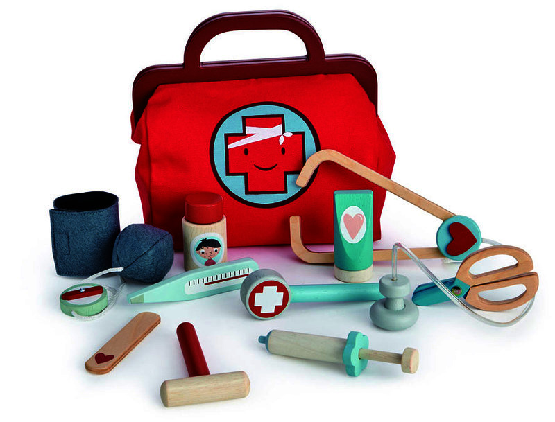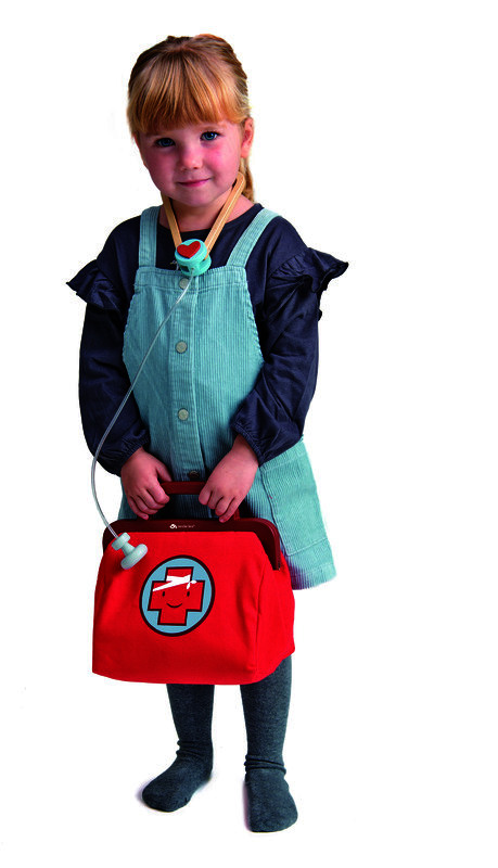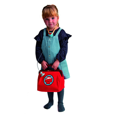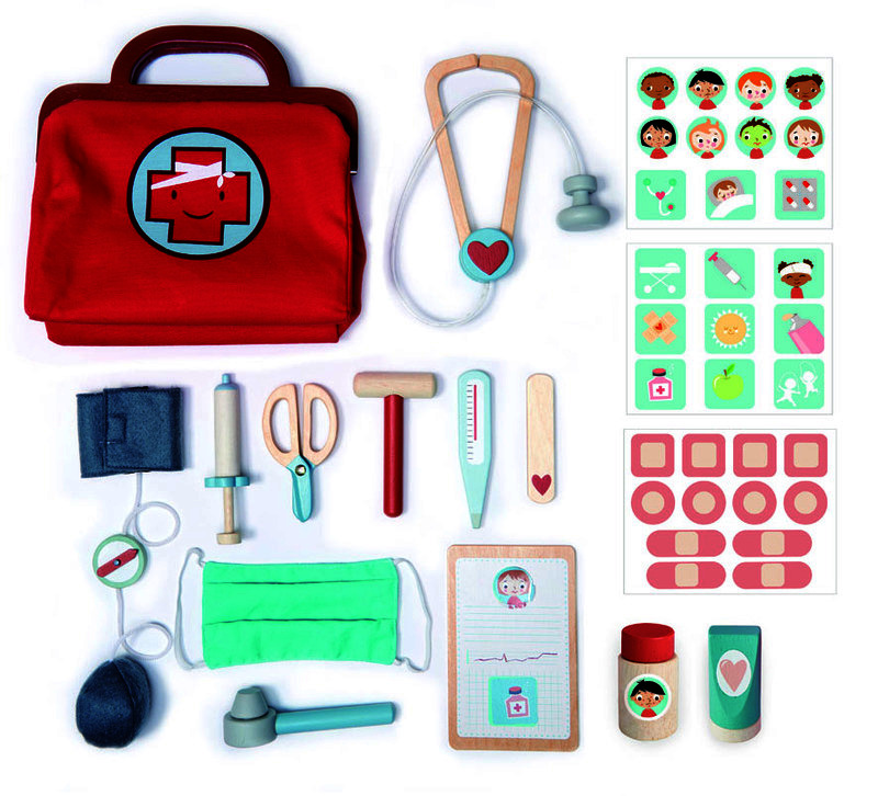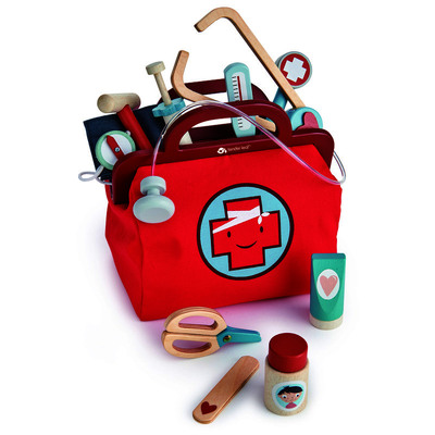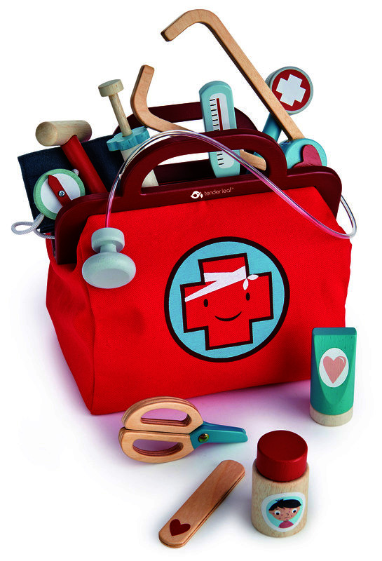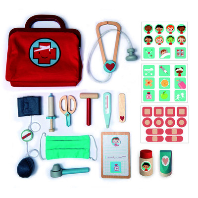 A retro-styled canvas and wood doctor's bag full of all the essentials for treating poorly patients. Set includes: a stethoscope, scissors, an ear probe, a syringe, a doctors knee hammer, a blood pressure monitor, a cloth mask, plasters, stickers showing ailments and remedies, a clipboard, a thermometer, a flat stick, a bottle of pills and a tube of ointment.