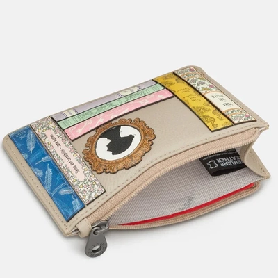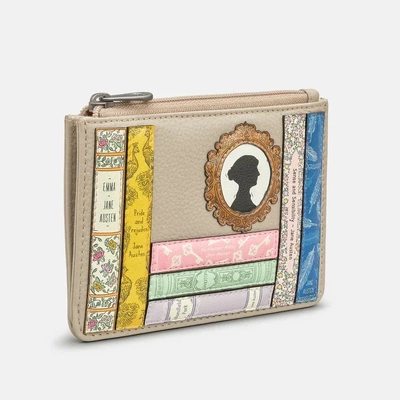 Jane Austen handcrafted leather zip top purse with RFID Protection has colourful bookend appliques on the front. From Yoshi's Bookworm range, this slim style fits cards, coins, and folded notes on the inside, and also has two useful back outer card slots for your most used cards.
