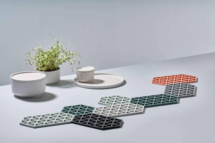 The hexagon silicone trivets are so graphically decorative that they invite you to lay out a bunch along the entire length of the table without placing anything on them. The series was created by the Danish designer trio VE2 and is available in many exciting colours. They are heat resistant up to 250°C and can be washed in the dishwasher.